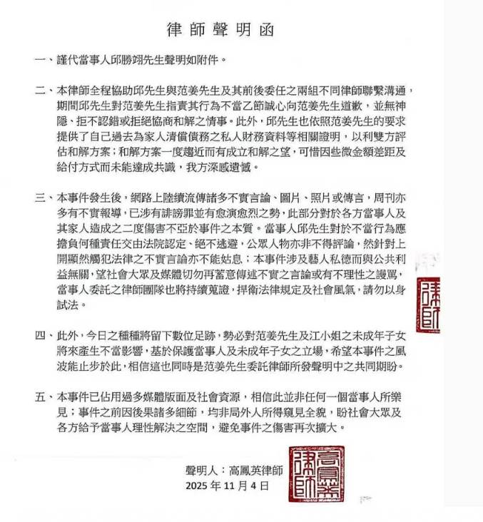 王子(邱勝翊)被范姜彥豐爆料和粿粿婚外情,范姜求償1600萬,粿粿表示無力承擔,並反擊家用都由她負擔,范姜連生產費用都不出,雙方互撕,晚間王子再度發出聲明,表示自己是真心道歉,但范姜提出的金額他真的無法負擔,因為他必須要幫父親還債,他協調希望能分期付款,但並未達成共識,他願意承擔一切,也盼流言蜚語能到此為止。
