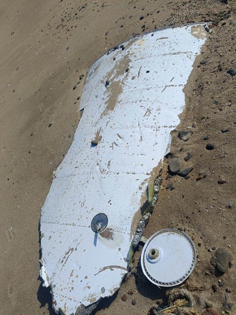 澎湖西嶼小門沙灘潮間帶今天下午發現一塊大型金屬殘骸,疑似飛機外殼,鑑定後排除為失事戰機。圖/取自Threads@e8I5f22021