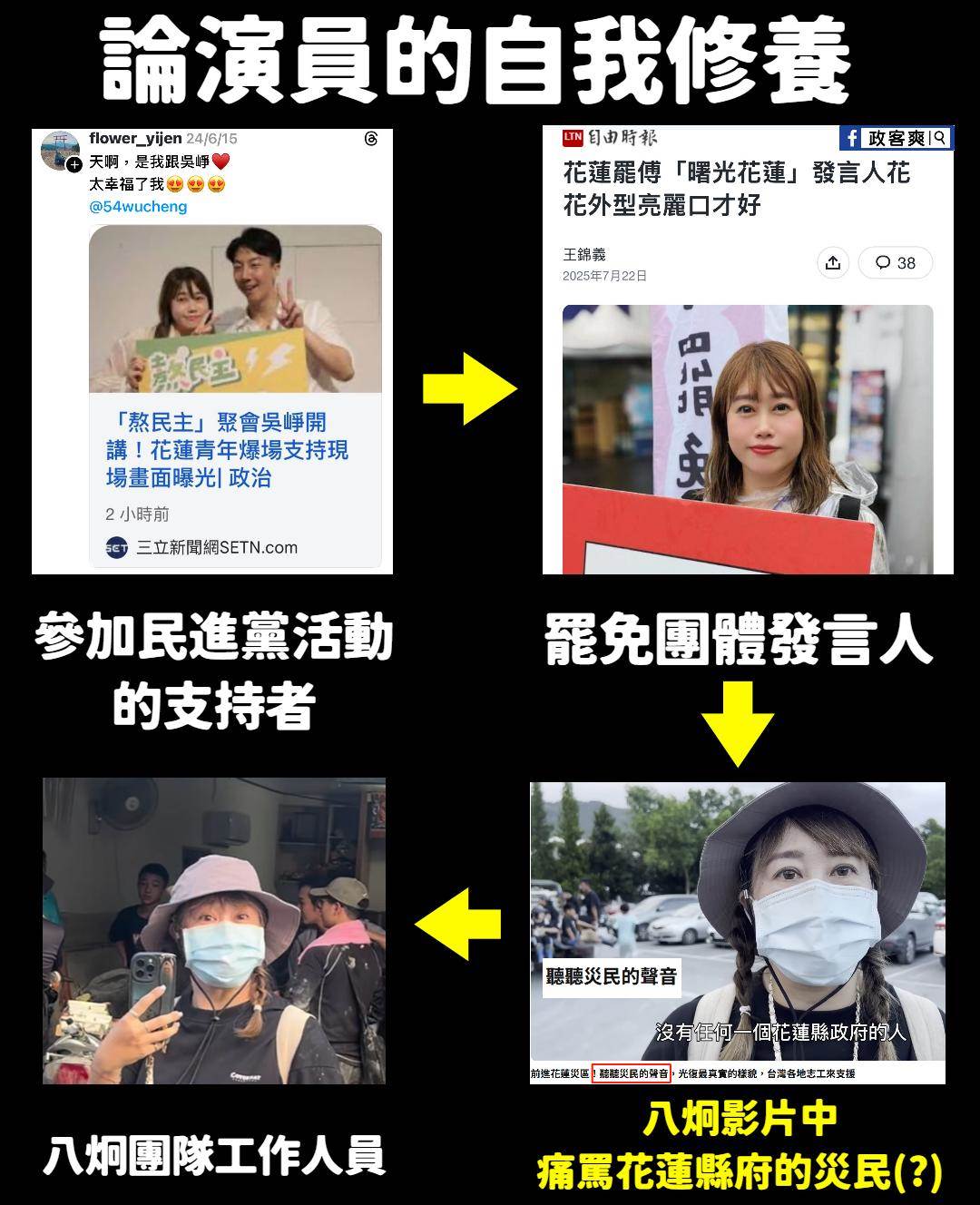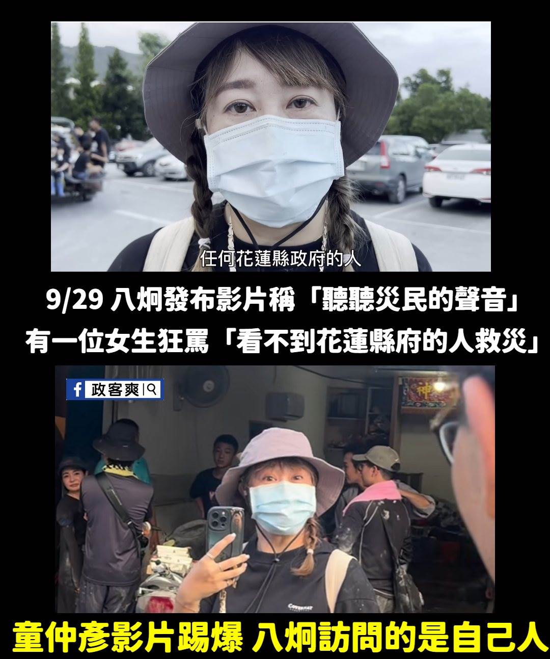 花蓮光復鄉在樺加沙颱風中,因馬太鞍溪堰塞湖溢流,導致全鄉幾乎都被黑泥覆蓋,日前教師節連假,上萬「鏟子超人」主動前往光復救災,然而網紅八炯先是被前台北市議員童仲彥踢爆,帶著團隊到現場拍片,如今又被抓包,影片「聽聽災民聲音」中批評「看不到花蓮縣政府救災」的「災民」,不只是八炯團隊的成員,還是罷團發言人,臉書粉專「政客爽」質疑,民進黨支持者、罷團發言人、八炯團隊,三位一體成為受訪災民代表?
