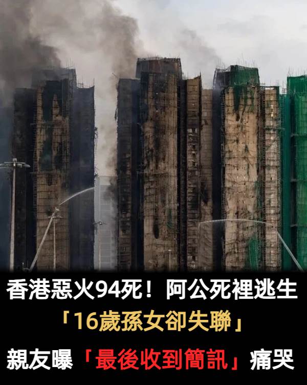 香港大埔宏福苑日前發生駭人惡火,截至今天上午6點,這場無情火災已造成94人死亡,其中包含1名消防人員,77人受傷,12人命危,還有200多人失聯,其中一名年僅16歲的女學生黎凱琪與她70多歲的奶奶及叔叔至今音訊全無,她生前傳出的最後訊息內容曝光後,讓無數網友心碎落淚。