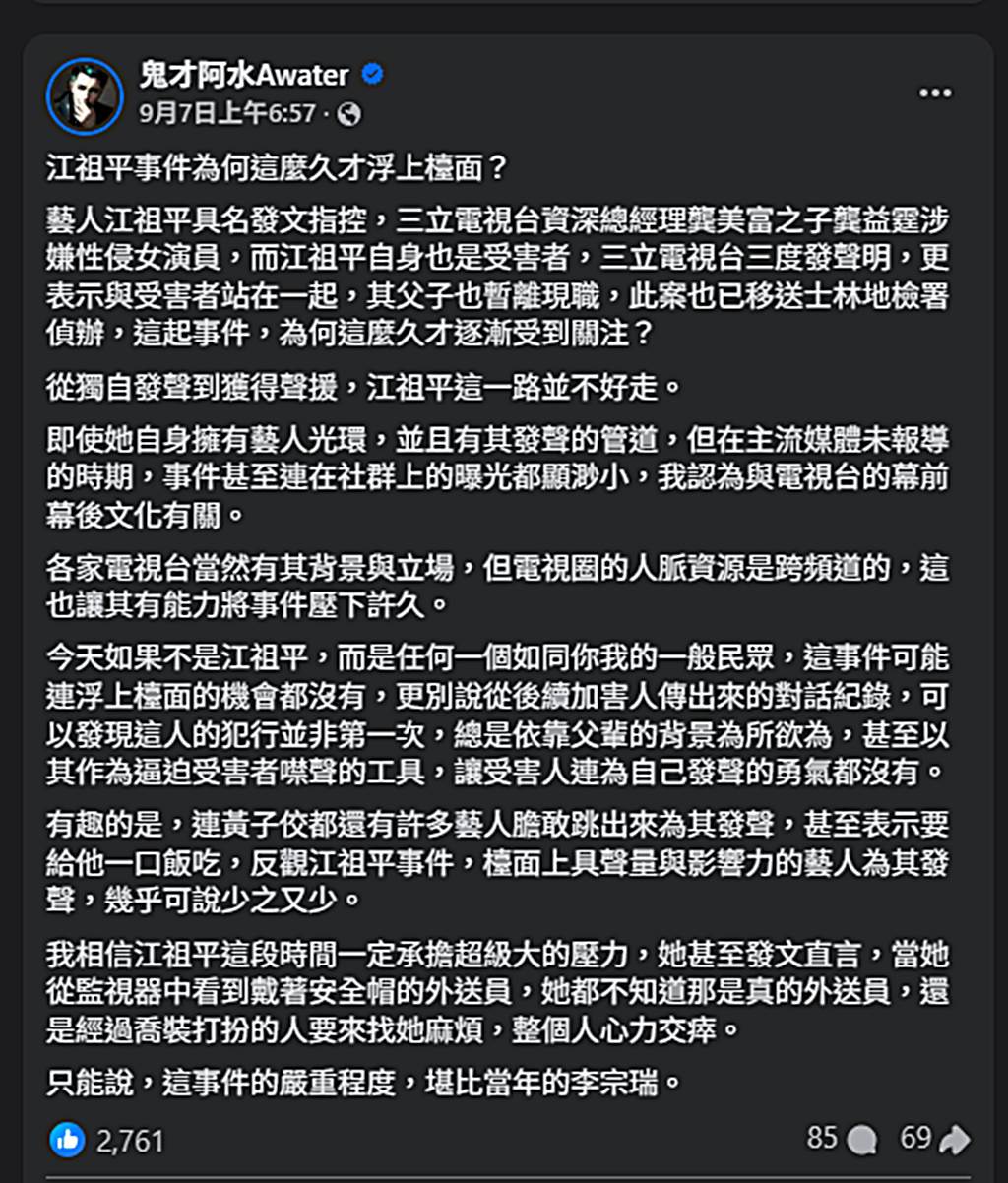 見此,網紅「鬼才阿水」說:「從獨自發聲到獲得聲援,江祖平這一路並不好走。即使她自身擁有藝人光環,並且有其發聲的管道,但在主流媒體未報導的時期,事件甚至連在社群上的曝光都顯渺小,我認為與電視台的幕前幕後文化有關。各家電視台當然有其背景與立場,但電視圈的人脈資源是跨頻道的,這也讓其有能力將事件壓下許久。」
