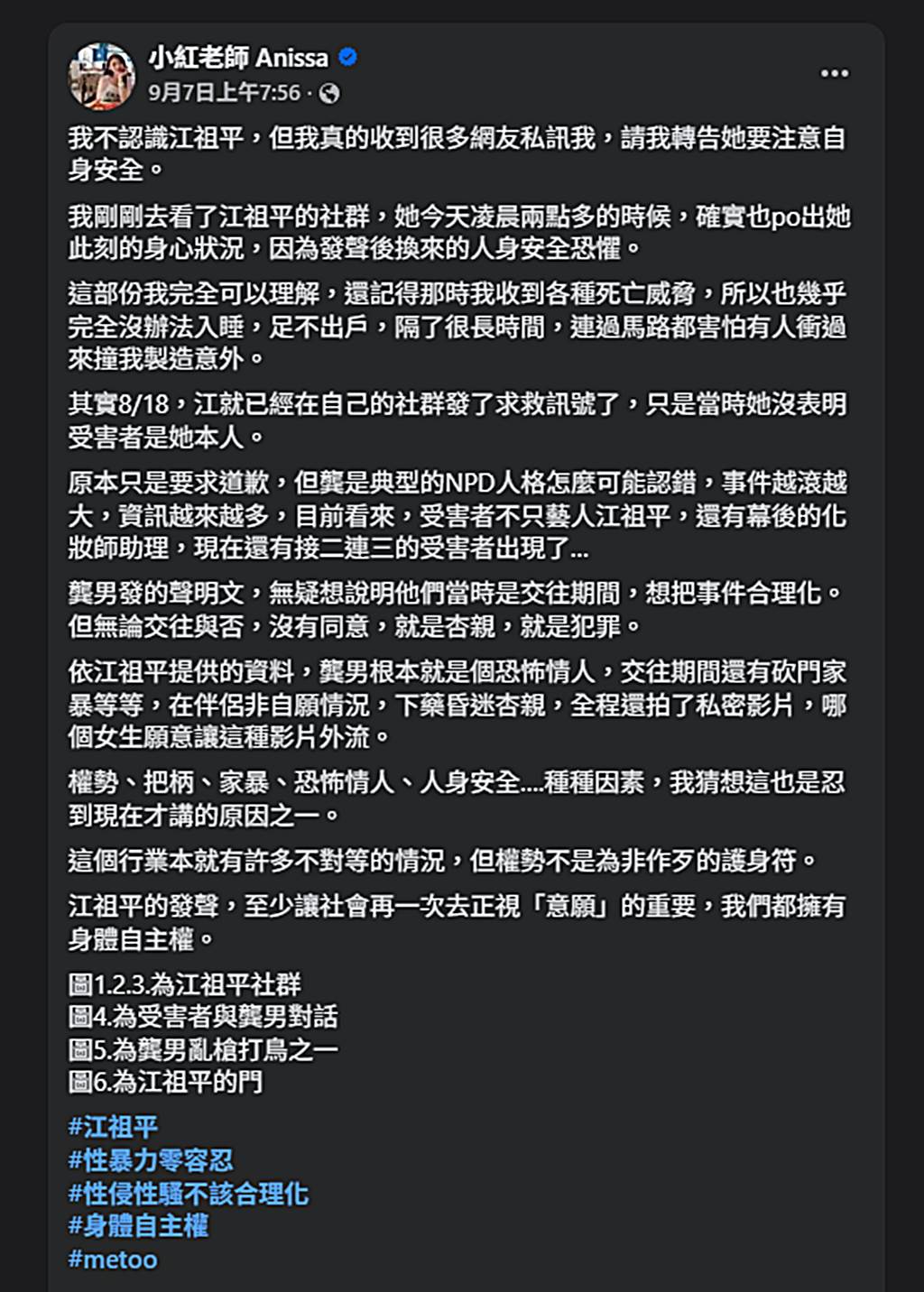 先前踢爆NONO性騷擾事件的小紅老師回應,可以感同身受江祖平現在有多驚恐人身安全,「這個行業本就有許多不對等的情況,但權勢不是為非作歹的護身符。