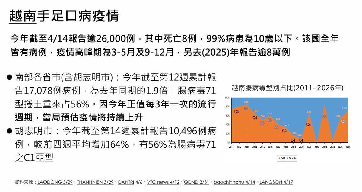 在國際方面,鄰近國家越南嚴峻,今年截至4月中旬已累計逾26,000例,且以EV71型為主,尤以胡志明市等南部省市持續出現重癥與死亡,預估將持續上升。大陸雖有下降,惟仍高于近年同期;香港、日本、泰國、新加坡目前則處于低點。