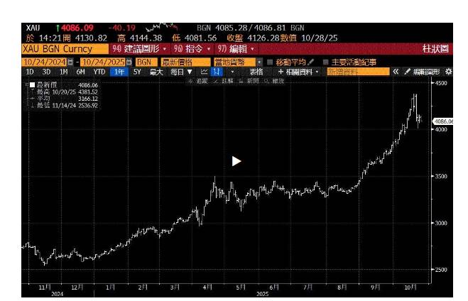 金價自周一創下每盎司4381美元的高位後,急轉直下。(彭博截圖)