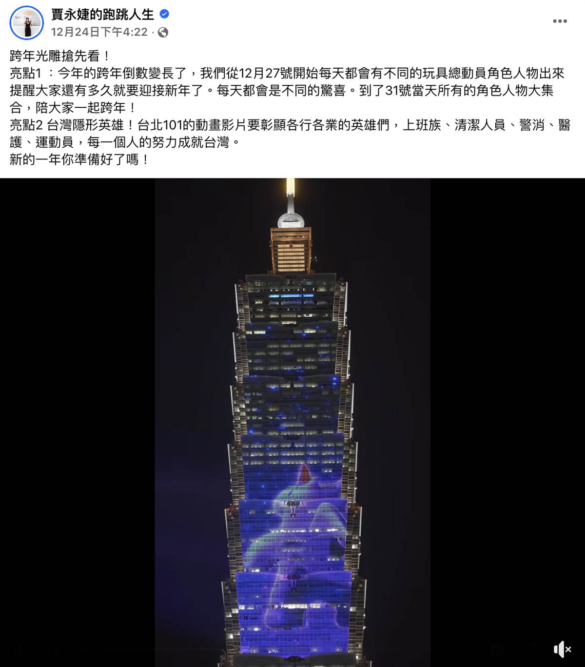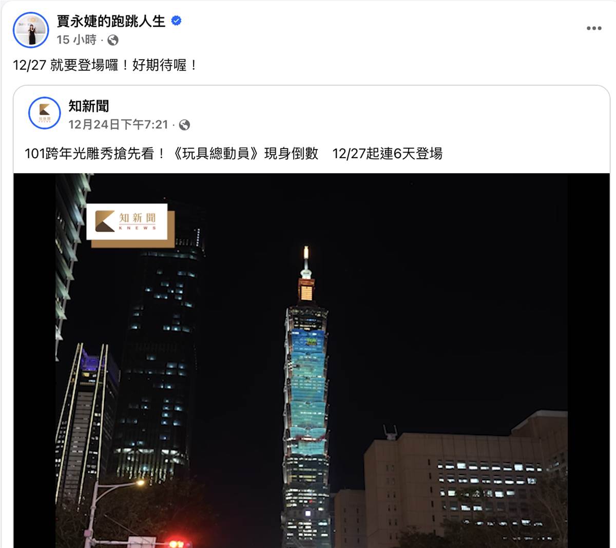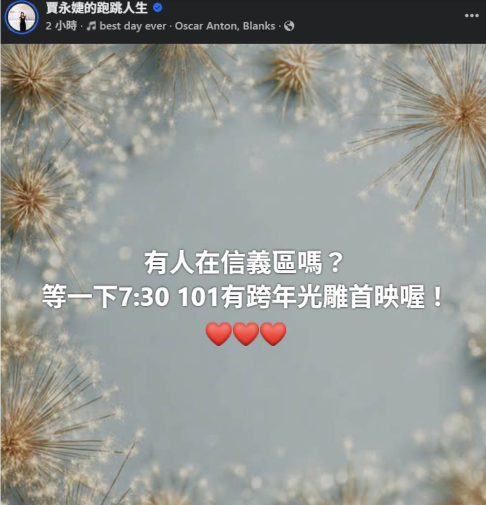 上週捷運台北車站與中山商圈爆發煙霧彈砍人悲劇,包含行兇者在內共造成4人死亡、11人受傷,至今仍讓全台灣震驚與害怕...根據《ETtoday星光雲》報導,身為台北101董事長的賈永婕于23日在社群平台發文,熱情預告當晚7點半將有跨年光雕秀首映登場,詢問是否有人在信義區附近,邀請民眾一同欣賞這場視覺饗宴。