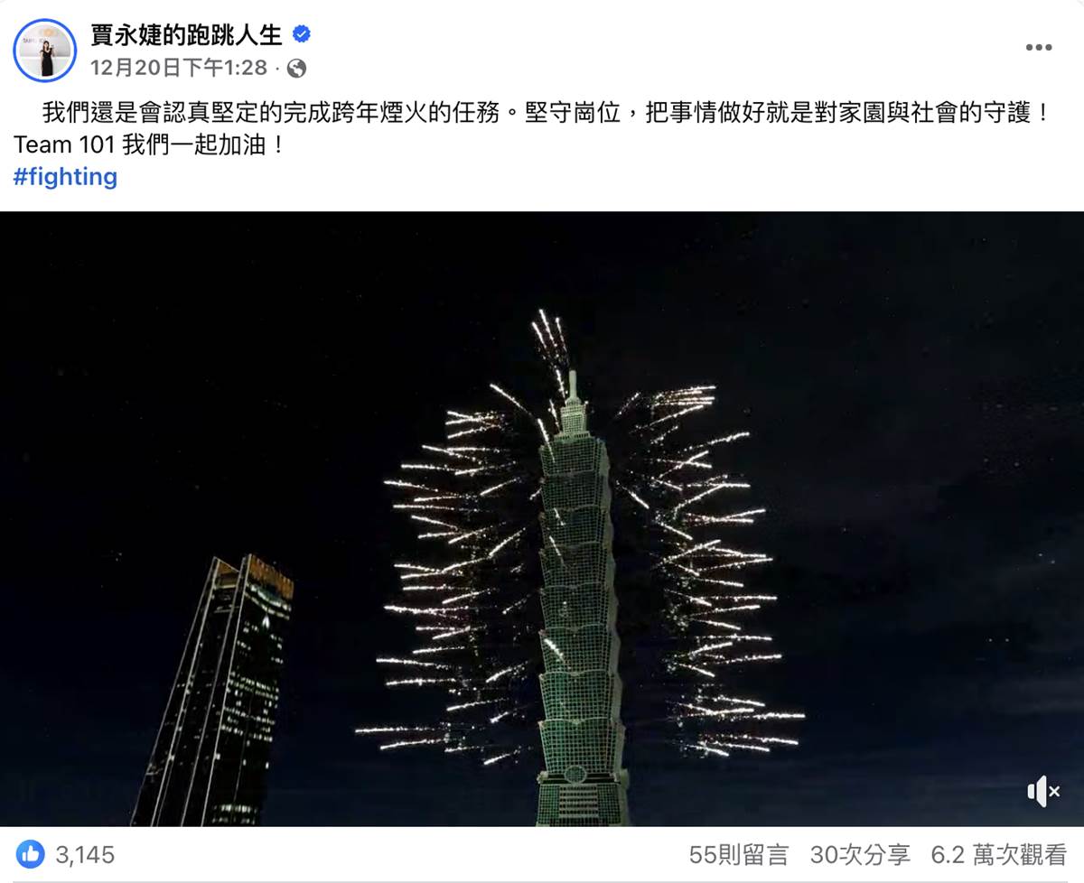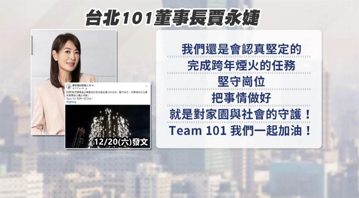 對于跨年活動她也特別發文表示:「我們還是會認真堅定的完成跨年煙火的任務。堅守崗位,把事情做好就是對家園與社會的守護!」指出這本身也是對社會安全的幫助,並強調相信政府能夠做好維安工作。