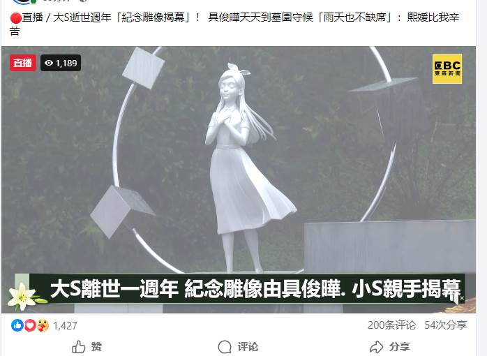 大S(徐熙媛)2025年2月2日不幸病逝于日本,享年48歲。今(2)日是大S忌日週年,下午2點紀念雕像揭幕儀式儀式開始,將由S媽、小S、她的老公具俊曄等及好友們,一同揭開包覆在外的粉色帆布。