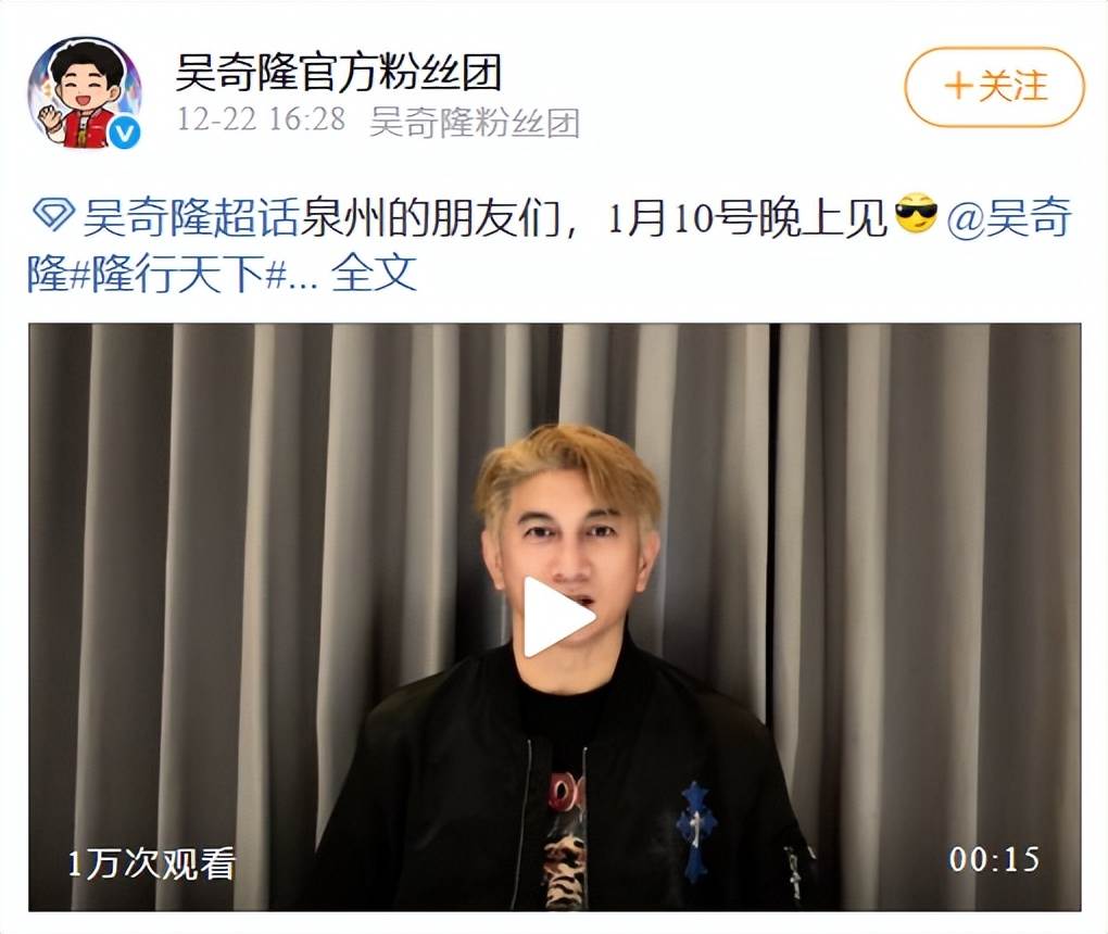 在12月22日,吳奇隆錄製VCR在好友的巡迴演唱會上擔任嘉賓,沒想到許久不工作的吳奇隆也開啟了回歸模式,染著金毛,穿著黑色棒球服,看起來倒確實不大像55歲的人,從臉部皮膚看,保養的還是不錯,但也難逃中年發福。