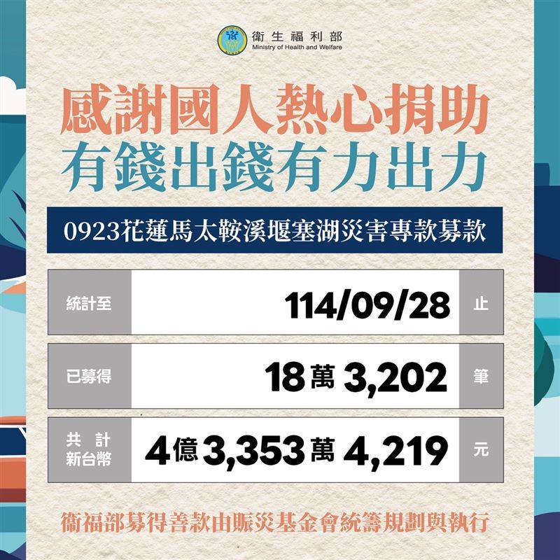 因應花蓮光復鄉災情,衛福部所轄公設財團法人賑災基金會啟動公益募款「0923花蓮馬太鞍溪堰塞湖災害募款專案」,勸募期間為114年9月25日至10月24日止。截至28日,共募得18萬3202筆款項,共計4億3353萬4219元新台幣。