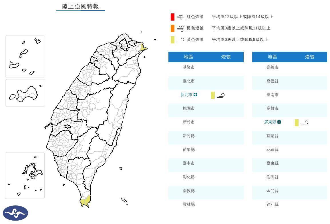 受環境風力急遽增強影響,交通部中央氣象署于27日下午發布陸上強風特報,預告自27日晚間起至28日晚間,台灣特定區域將進入風力巔峰期。其中新北市與屏東縣已列入「黃色燈號」警示范圍,區域性地區平均風力預計將達6級以上,陣風更有機會突破8級,強勁風勢不容小覷。