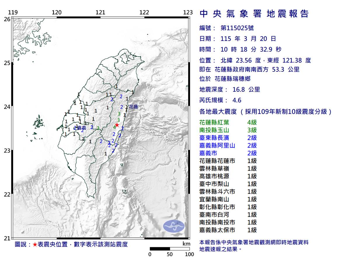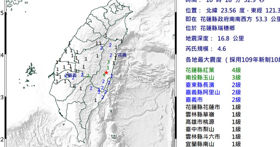今(20日)上午10時18分,花蓮發生芮氏規模4.6地震,位置北緯 23.56度,東經 121.38度,即在花蓮縣政府南南西方 53.3 公里 ,位于花蓮縣瑞穗鄉,地震深度16.8公里。花蓮縣地區最大震度 4級。