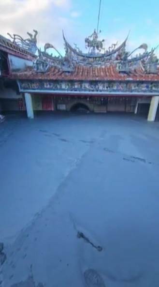 從空中俯瞰花蓮馬太鞍溪堰塞湖重災區的保安寺,可以看到圍牆內的廣場仍堆滿泥沙。救災團隊出動2台挖土機進行清淤工作,泥沙堆積深度驚人。