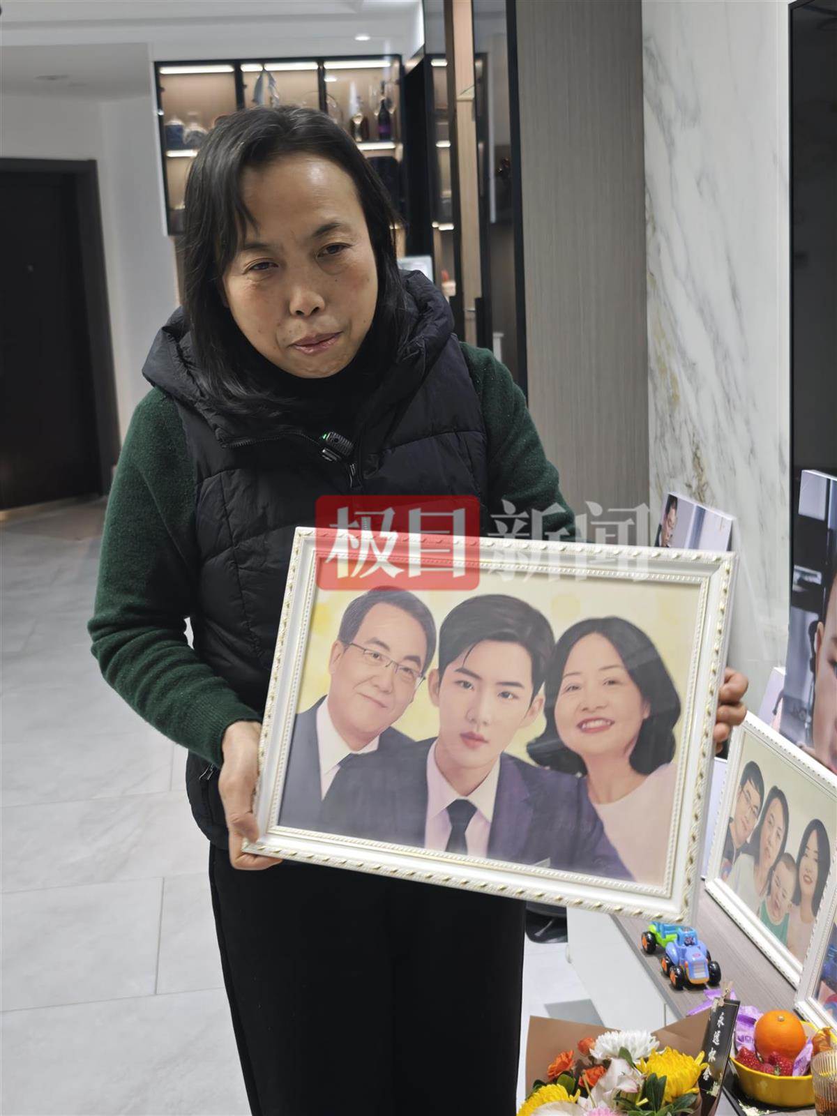 胡娟抱著網友畫的一家三口的「未來」畫像