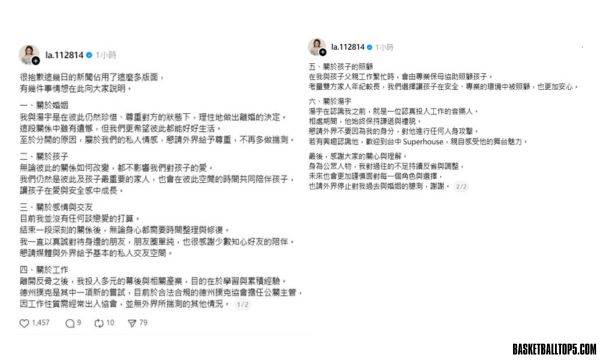 網紅蕾菈去年9月宣布與湯宇結束婚姻關係,相關動向持續受到外界關注。近期她被拍到進出網紅晨灰住處,引發緋聞揣測,對此,蕾菈于今(23)日深夜透過 Threads 發布6點聲明,親自出面澄清。