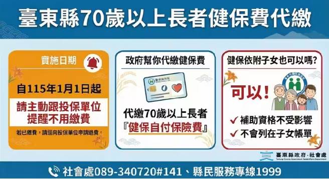 圖片來源 / 翻攝自臺東縣社會處說明,凡設籍臺東滿1年以上,且年滿70歲以上的長者,就能獲得健保費代繳服務,健保自付保險費將由縣府自動協助代繳,依附在子女的健保名下的長輩也不影響資格,費用不會列入子女的健保賬單。
