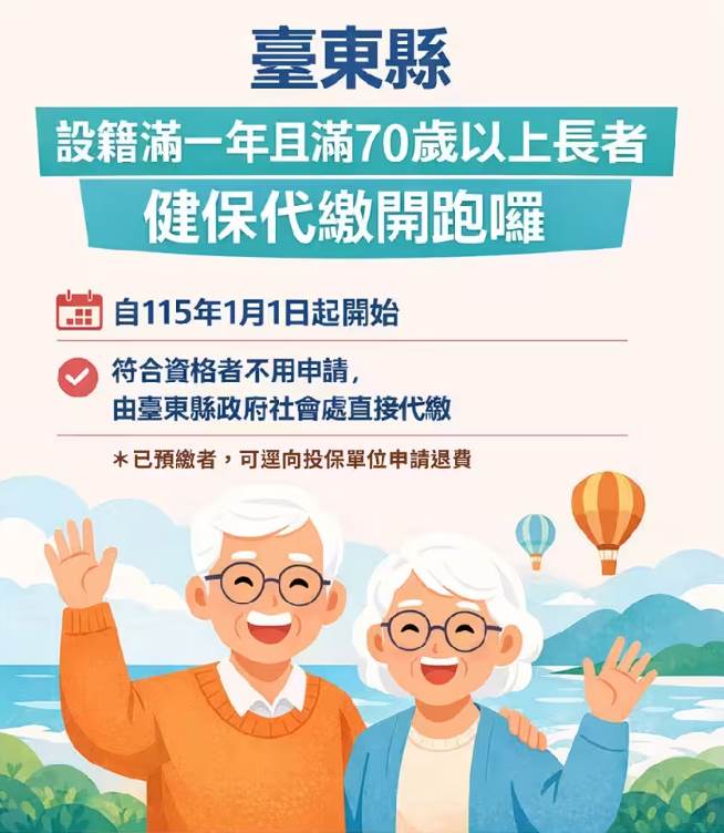 根據媒體《TVBS》、《風傳媒》的報導,為減輕高齡長者的醫療經濟負擔,臺東縣政府宣佈自115年1月1日起,正式開辦「長者全民健康保險自付額代繳」服務,由縣府主動支應長者保費,連同重陽敬老禮金也從500元加碼至2000元,預計有4.5萬名高齡者能受惠。