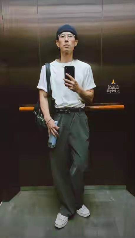 照片裡,他戴個深藍色瓜皮帽,配細邊大框眼鏡,耳朵上釘著細耳飾,穿件鬆鬆垮垮的白T恤,揹個單肩包,下身是闊腿休閒褲,腳踩帆布鞋,整個街頭休閒風,看起來蠻輕鬆時尚。