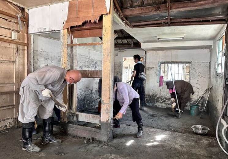 花蓮光復鄉因馬太鞍溪堰塞湖潰堤造成嚴重洪災,華藏淨宗弘化基金會董事長悟道大和尚展現佛法慈悲精神,不僅透過華藏淨宗弘化基金會與中華華藏淨宗學會,捐贈計1000萬元至「花蓮縣重大災害民間賑災捐款專戶」,更指示多位法師與四眾弟子第一時間深入災區,現場提供熱食與物資,並由法師親自操作小型怪手協助清淤,展現救災的決心。畫面可見,法師開著小型怪手,在滿是泥濘的房間清淤泥,又有多位法師和義工合作,拿著鏟子在屋內辛勤鏟泥,並和義工協力搬運物資,深入災區親力親為,希望能為災民盡一份心力。