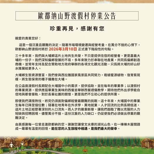 該業者昨日于歐都納品牌官網和渡假村官網發布停業公告,以「珍重再見,感謝有您」為開頭,寫道「這是一個沉重且艱難的決定。隨著市場環境變遷與經營考量,在萬分不捨的心情下,歐都納山野渡假村將于2026 年3 月10日正式畫下階段性的句點。