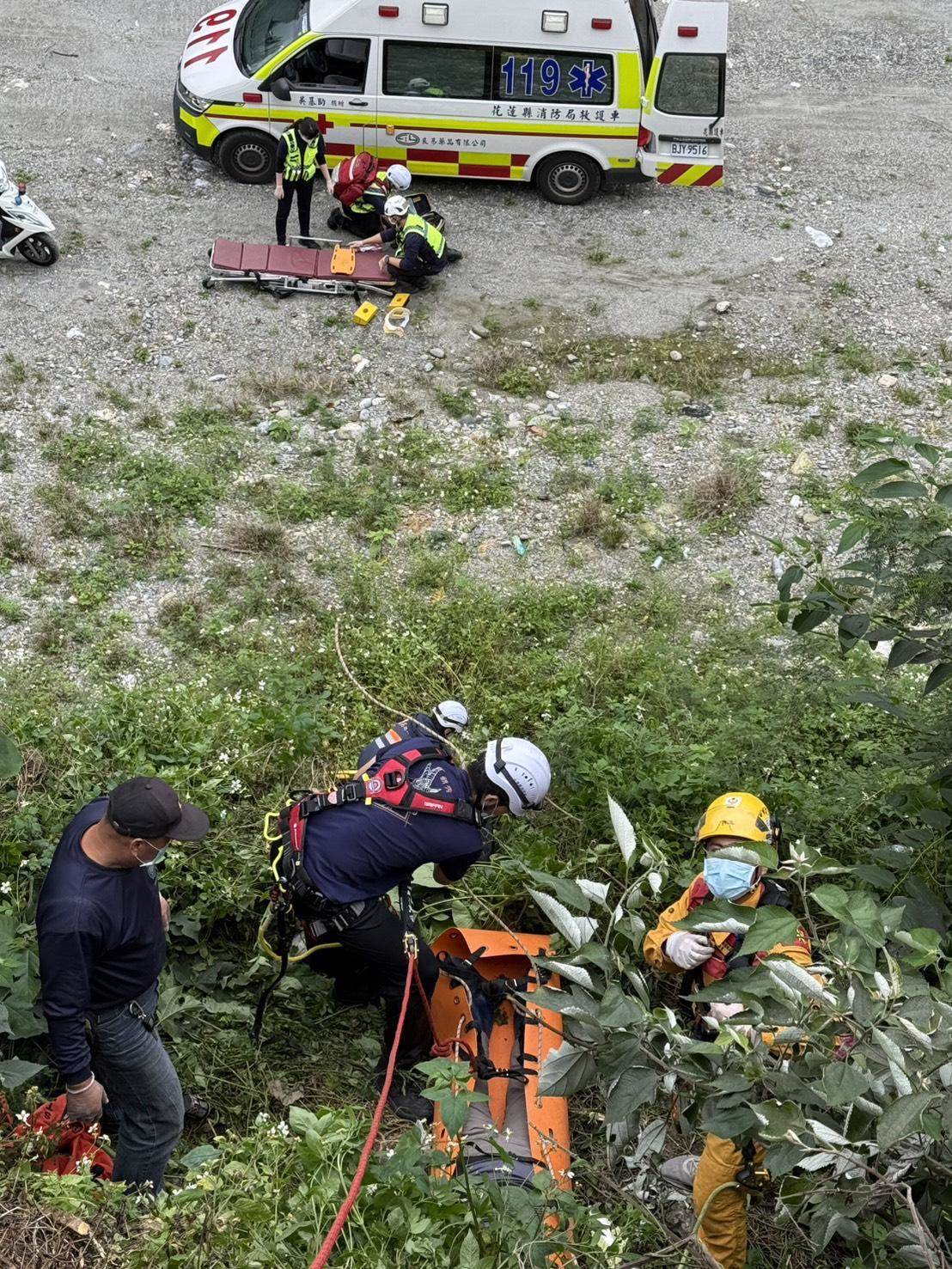 花蓮縣秀林鄉一名7旬婦人不慎墜落約五公尺深的垂直邊坡,消防人員抵達現場後,評估環境搬運困難,隨即架設繩索系統實施救援。經現場初步檢查,該名婦人已無生命跡象,墜落意外原因有待調查。(圖/翻攝畫面)