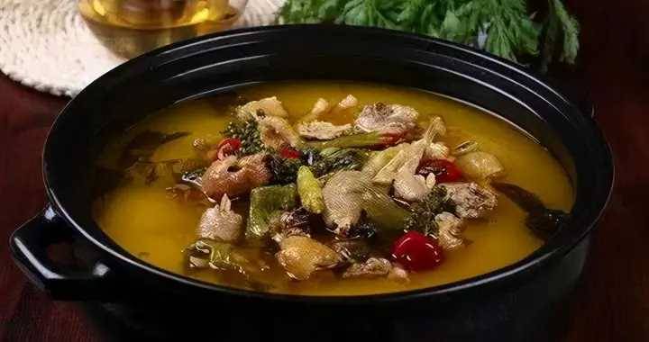砂鍋內下入酸菜、泡椒、子彈頭辣椒、雞腿肉,倒入白湯、香料水,調入鹽、味精、胡椒粉攪勻,置于煲仔檔開中火煮8分鐘,起鍋烹白醋即可上桌。