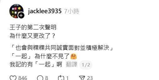沒想到,事件看似平息後又出現新變化。有網友發現,王子在12日凌晨再次修改宣告,原先的文字「也會與粿粿共同誠實面對並積極解決」被悄悄刪除其中的「一起」二字,讓不少粉絲納悶:「為什麼要拿掉『一起』?」「是立場變了嗎?」