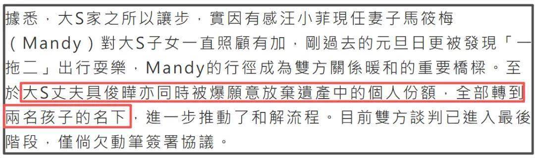 據臺媒報道,具俊曄願意主動放棄大S遺產,全部轉入兩個孩子的名下。