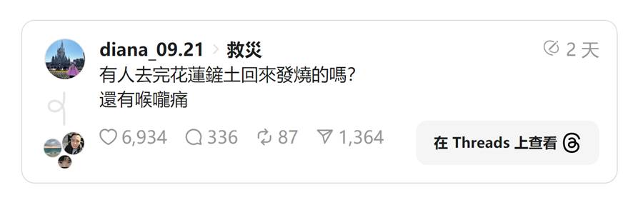在社群平台Threads上,有志工發文詢問是否有人在參與救災後出現身體不適癥狀,引發熱烈討論。眾多參與者紛紛分享自身經歷,「待了四天三夜,早上起來喉嚨痛咳嗽、沒精神」、「喉嚨也乾乾沙沙的,到後來鏟到過敏」、「當天回來開始眼睛痛」、「我是狂拉肚子,補充益生菌、電解水才好點」、「我跟我男友都發燒,喉嚨爆痛」。