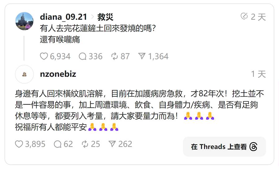 有一名網友更透露,身邊一名32歲的志工因投入災區挖土救援,疑因過度勞累不慎引發「橫紋肌溶解癥」,目前正在加護病房接受緊急治療。他也提醒,「挖土並不是一件容易的事,加上周遭環境、飲食、自身體力,有無疾病、是否有足夠休息等等,都要列入考量,請大家要量力而為!」。