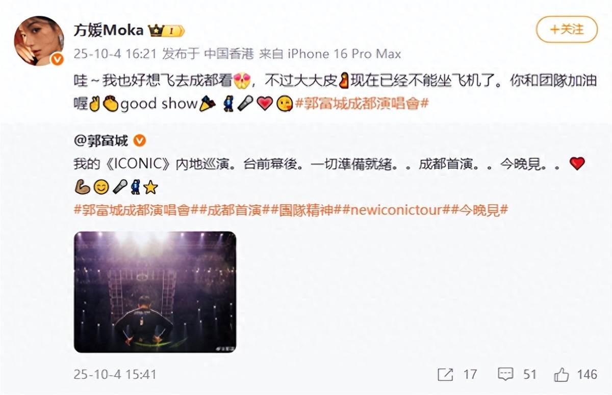 10月4日,方媛發文說她很想去成都看郭富城的演唱會,但是因為大肚子無法坐飛機。