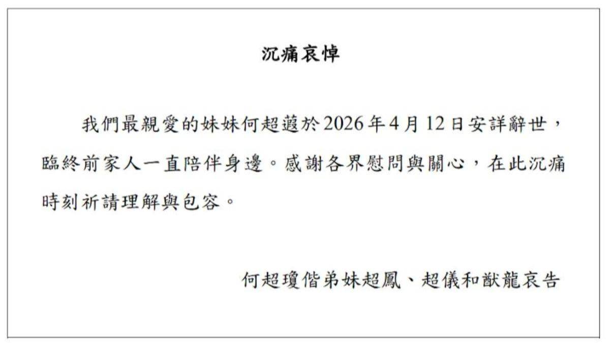 公告由何超瓊、何超鳳、何超儀與何猷龍共同署名,內容指出:「我們最親愛的妹妹何超蕸已于2026年4月12日安詳辭世。