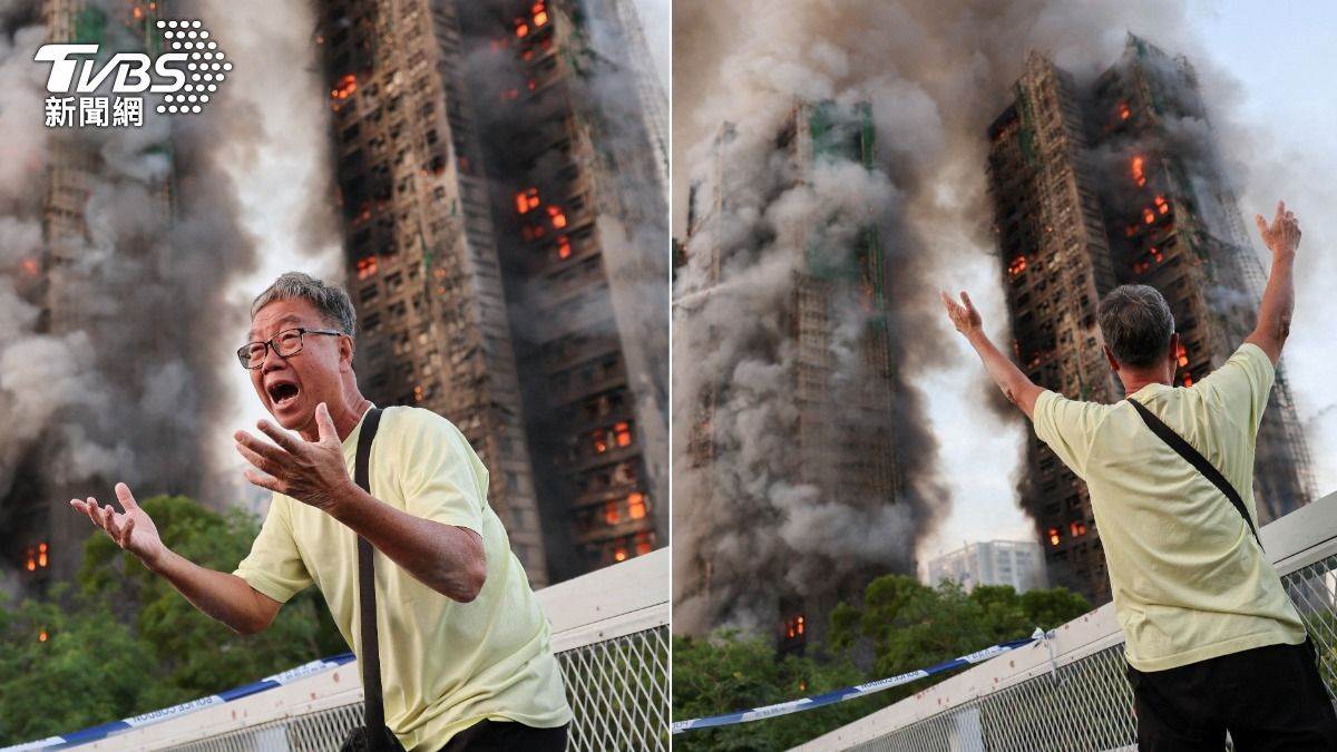 相較前述家屬的焦急與擔憂,外媒《路透》拍下的1名71歲老翁就更令人痛心,這張照片中可以見到老翁站在燃燒中的宏福苑外,一邊痛哭流涕、一邊聲稱自己的妻子「還困在裡面」,另1張照片更拍下他高舉雙手、無奈地看著宏福苑的背影。