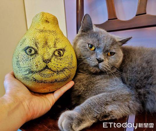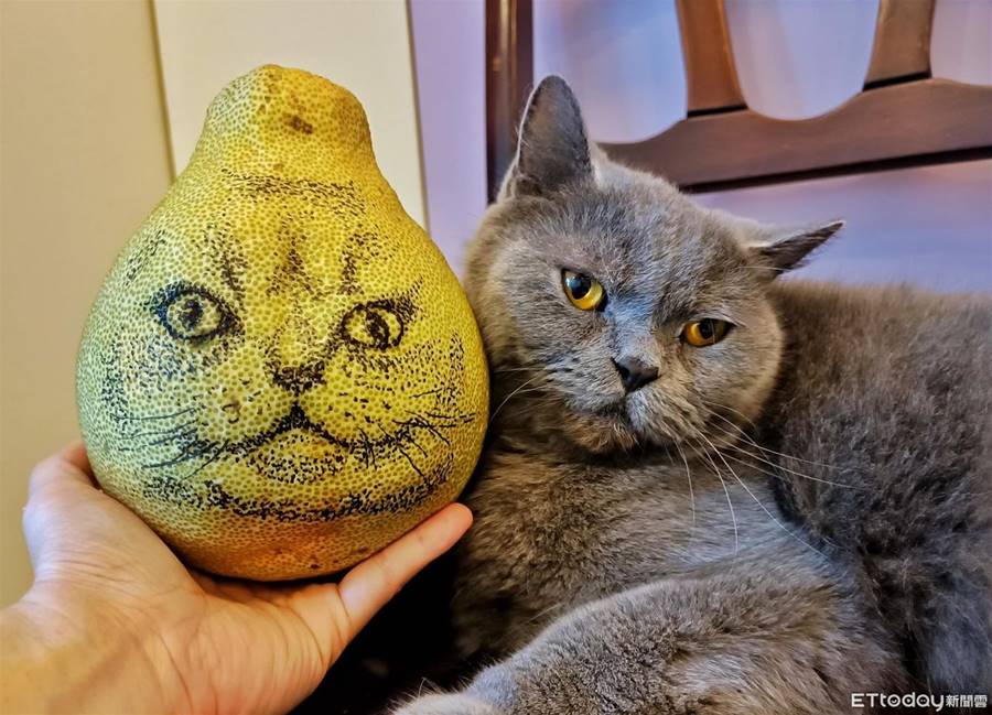 靈魂畫手是你!新竹市飼主Sammie是藝術家兼美術老師,中秋連假他拿起一支黑色麥克筆,在一顆未剝皮的柚子上描繪愛貓「肉丸」的畫像。沒想到成品完成後,拿到肉丸臉旁一比對,竟然跟本尊幾乎一模一樣,五官、神韻都完美呈現在柚子表皮上,讓網友紛紛稱讚說「好像好可愛」。