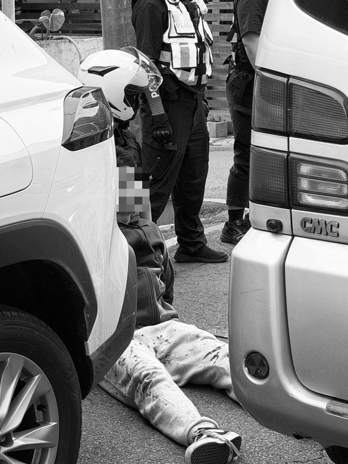 警方獲報後立刻派遣線上警力趕赴現場,員警一路騎警用機車尾隨陳男車輛追到西屯路1段492巷內。不料陳男慌亂中鑽入無尾巷,在無路可退的窘境下只能自行開門下車。員警立即下車喝令陳男下車,陳男下車後舉手投降自己趴下,隨即遭警員強勢壓制並帶回偵辦。目前陳男已被依法拘留,全案的確切犯案動機與詳細經過,仍有待檢警進一步調查釐清。