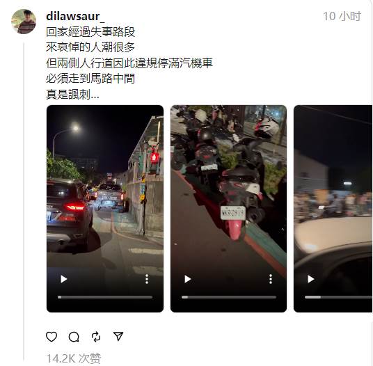 然而民眾的愛心與思念,似乎有些超出當地的負荷能力,有網友在threads上發文,表示事發現場的供品幾乎占滿了整個草皮。此外,還有人發現因為前來哀悼的人潮眾多,不少汽機車居然直接違停在人行道上,真是相當諷刺。