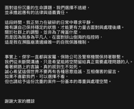 吳侑函則在ig發聲明,身為平凡人,在面對排山倒海的指控時,這是自己在瀕臨崩潰邊緣唯一的自我保護機制。老公一直與家屬、保險公司及警察機關保持聯繫,從未斷開溝通,只希望將空間留給真正需要處理問題的人。吳侑函強調,面對這份沉重的生命課題,我們選擇不逃避,並承擔起應有的法律責任與道義責任。盼外界給基本的尊重與處理空間。