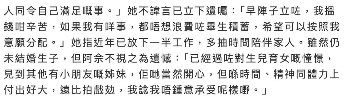 與此同時她自曝已經立下了遺囑,原因很簡單,因為賺錢不容易,她還是很想按照自己的意愿來分配財產,不想自己突然有事了,浪費畢生的積蓄。而在疫情之后,明顯發現佘詩曼減產,并且大多時候都直接香港的工作,就是希望能有更多時間陪伴家人。至于結婚生子,人生到了50歲,對這些已經不再憧憬。