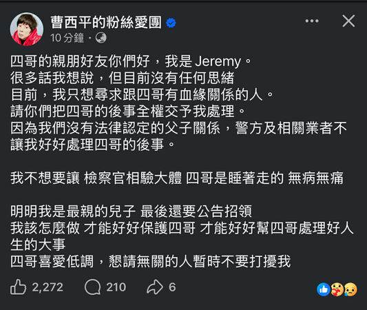 事發隔日,乾兒子Jeremy透過社群平臺發出一篇情緒激動的宣告,向曹家有血緣關係的親人喊話。他在文中表示自己思緒混亂,但最想做的就是尋求曹家人的協助,希望對方能將後事全權交由他處理。由于兩人並非法律認定的父子關係,相關單位與業者都不允許他主導喪葬事宜,這讓他相當無助與痛心。
