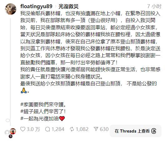 官兵發文表示,「我沒偷鄰兵叢林帽,也沒有撿遺漏在地上小帽」,自己在部隊時原本就多帶一頂叢林帽,平時登山也會使用,投入救災當天,因為太過疲憊,一度誤以為沒有拿到公發帽,便隨手帶了登山帽出勤,直到結束任務休息時,才發現公發的叢林帽其實放在腰包裡,于是決定將私人的叢林帽送給經常在路旁替國軍加油、鼓勵的小女孩。