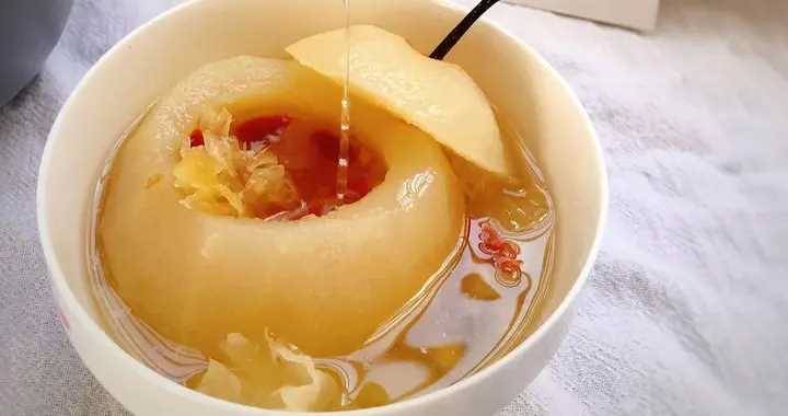 1、用水清洗干凈梨子后,頭的2-3厘米處橫切開,然后把雪梨去皮(可以不去皮),用挖勺挖掉梨核。