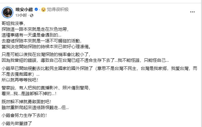 晚安小雞于社群平台臉書直播指出,他在28日晚間前往一處廢棄醫療機構進行約1小時的探險。開播初期,他先向觀眾講述該地點相關的靈異傳聞,隨後步入建築物內拍攝。然而,就在直播即將進入尾聲時,門口已有2名警員守候,當場要求他關閉錄影設備,並將其帶回警局進一步釐清狀況。