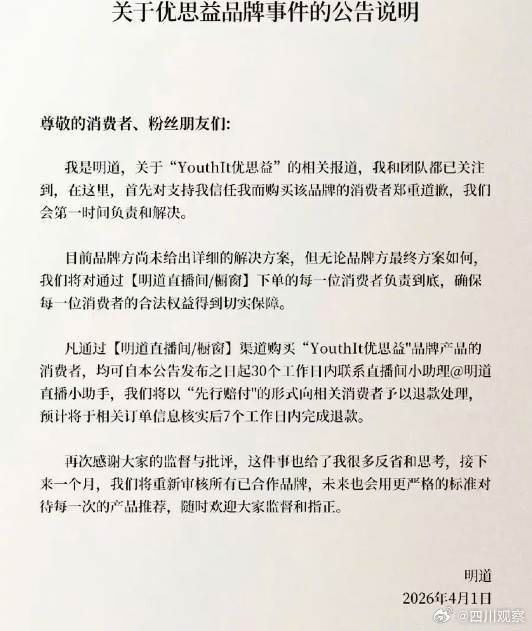 明道工作室則透過律師聲明,強調已緊急核查事件並終止合作。明道承諾自公告30天內,消費者可聯繫直播間小助理辦理退款,並于核實訂單後7個工作日內完成退款處理。明道表示,「無論品牌方最終方案如何,他都將對消費者負責到底」,展現高度負責態度。