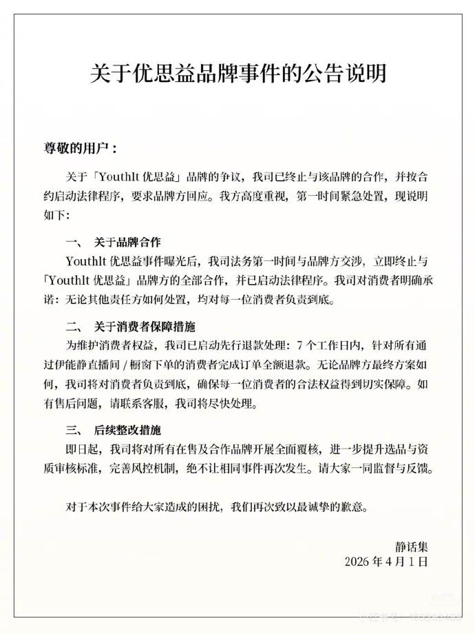 聲明指出,7個工作日內針對透過伊能靜相關渠道購買「優思益」產品的消費者,將全額退款,確保消費者權益受到保障。三位藝人皆強調對消費者負責,並積極協助受害者申請退款,力求平息爭議。