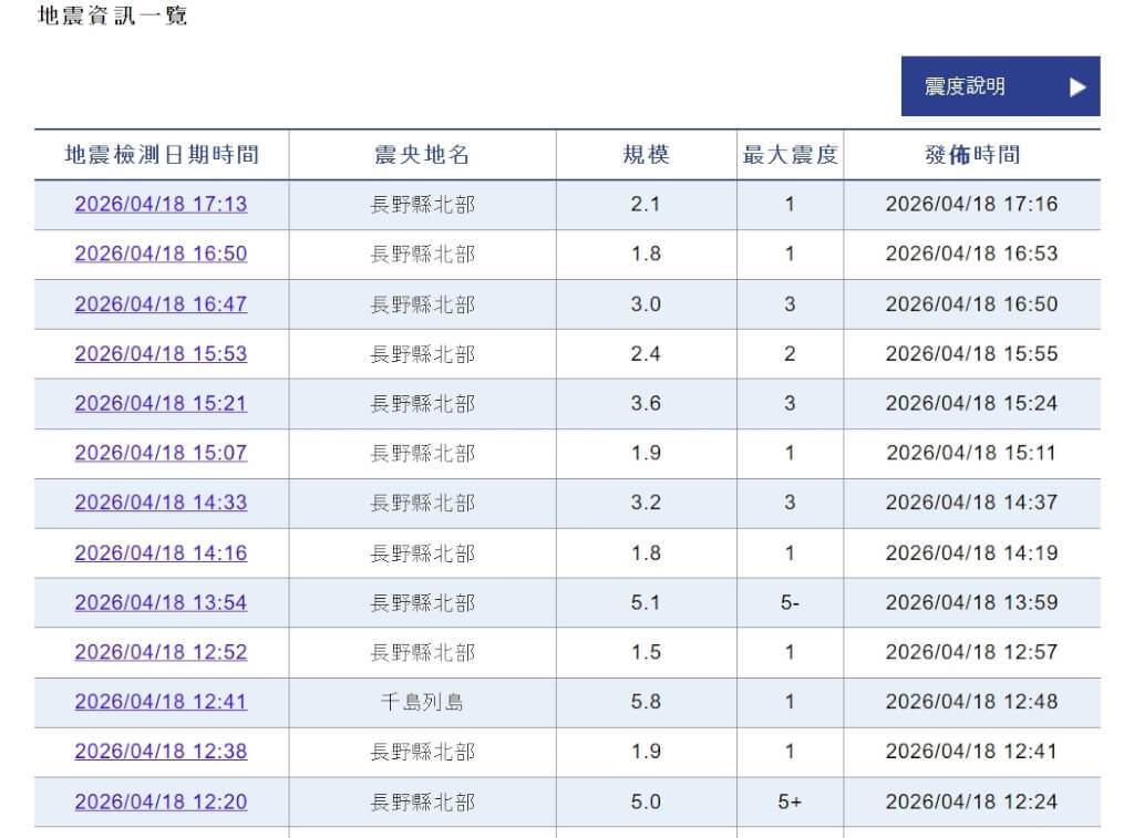 日本長野縣18日接連發生地震,大町市觀測到最大震度5強。(圖/翻攝自氣象廳網頁data.jma.go.jp)