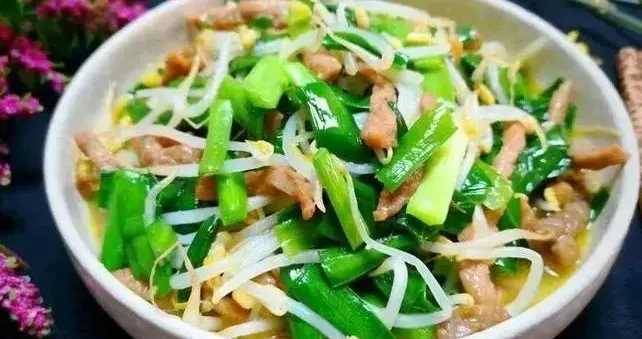 綠豆芽400克,韭菜1小把,蔥一棵,蒜三瓣,干辣椒兩個,醋兩勺,鹽適量,生抽兩勺