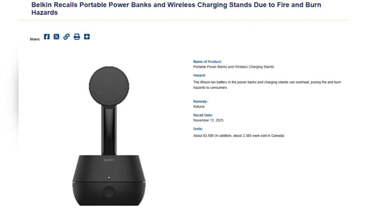 此次召回范圍涵蓋型號MMA008的黑色無線充電支架、型號BPB002的黑色行動電源,以及型號PB0003的黑白兩色行動電源。民眾可透過檢視充電座底部或行動電源背面的型號與序號標示,確認手中產品是否在召回清單內。這些商品過去5年間于Best Buy、Target、Walmart等美國實體賣場,以及Belkin官網、Amazon與TikTok等線上通路銷售,售價從新臺幣886元到5,500元不等,銷售范圍遍及全球多國。