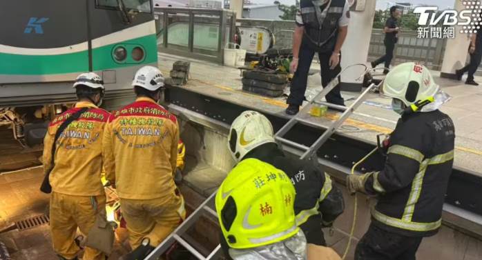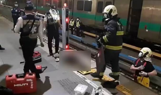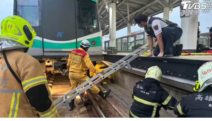 女性旅客不明原因墜軌。(圖/TVBS)高雄捷運R21都會公園站,(27)日下午16時48分許傳出有女子不明原因落軌且遭列車撞擊,卡在車底與鐵軌間縫隙,事發當下高捷公司立刻降級運轉,班次也受到影響。警消到場確認女子已經沒了呼吸心跳,遺體移出後,待警方及檢察官相驗。女子落軌 卡車底與鐵軌間縫隙間亡