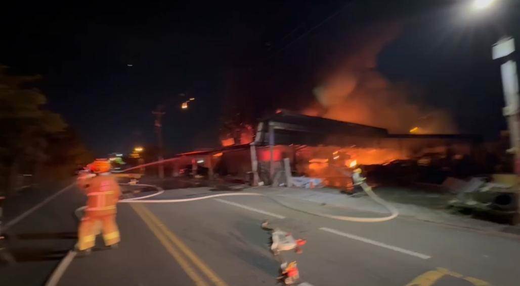 據了解,警消人員接獲報案後隨即趕抵現場,除對周邊道路實施封閉管制外,並佈設水線展開灌救行動,共佔地130坪兩層樓,截至目前為止,火勢仍持續燃燒,尚未獲得有效控制,救災工作仍在進行中。