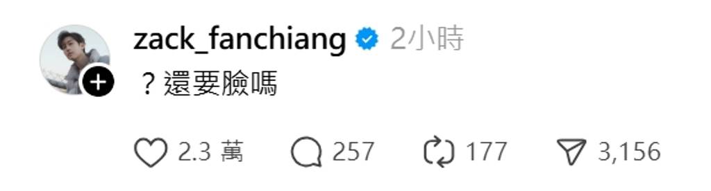 相關畫面經媒體報導後,范姜彥豐隨即在Threads留言開酸,僅以「?還要臉嗎」5字回應。貼文曝光後短短2小時,便吸引超過2.2萬人按讚,迅速在網路上發酵。