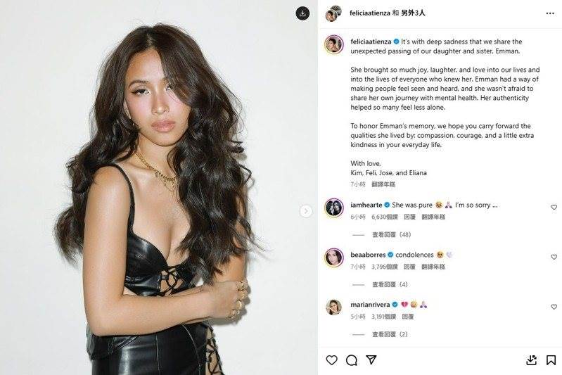 菲律賓演藝界新秀、網紅以及精神健康倡導者艾曼.艾天薩今天辭世,年僅19歲。她是半個台灣人,外祖父是菲律賓台商界元老。